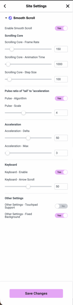 The Smooth Scroll feature enhances the scrolling experience on a website by providing fluid and controlled motion effects, reducing abrupt jumps while navigating through content. It can be configured in both Global Style (Site Settings) and Page Settings.